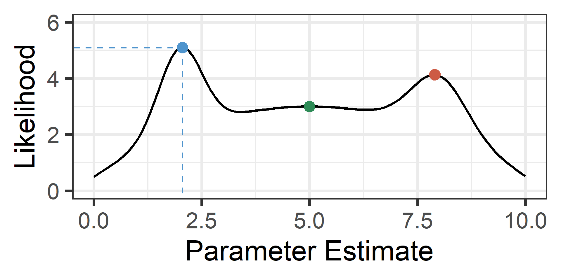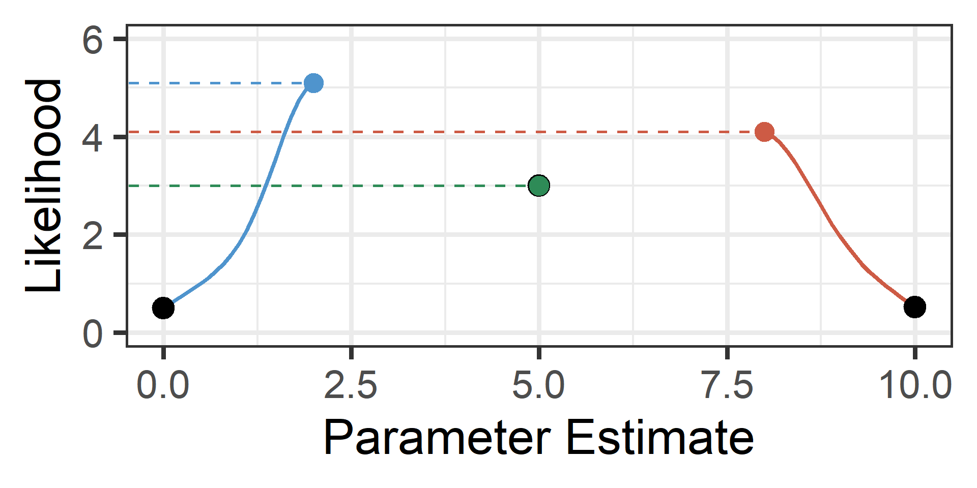 Our maximum likelihood estimate would thus be \(x \approx 2\)
